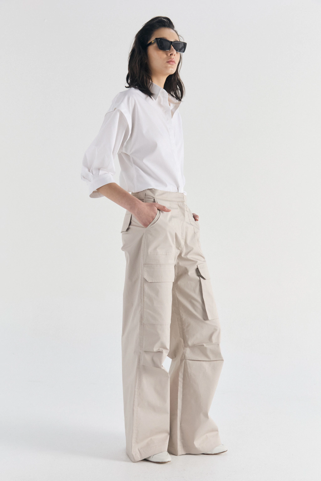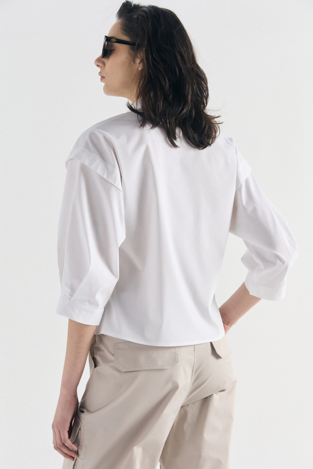 Camisa de lineas modernas, hombros importanes, volumen en la manga logrado con tablas encontradas.