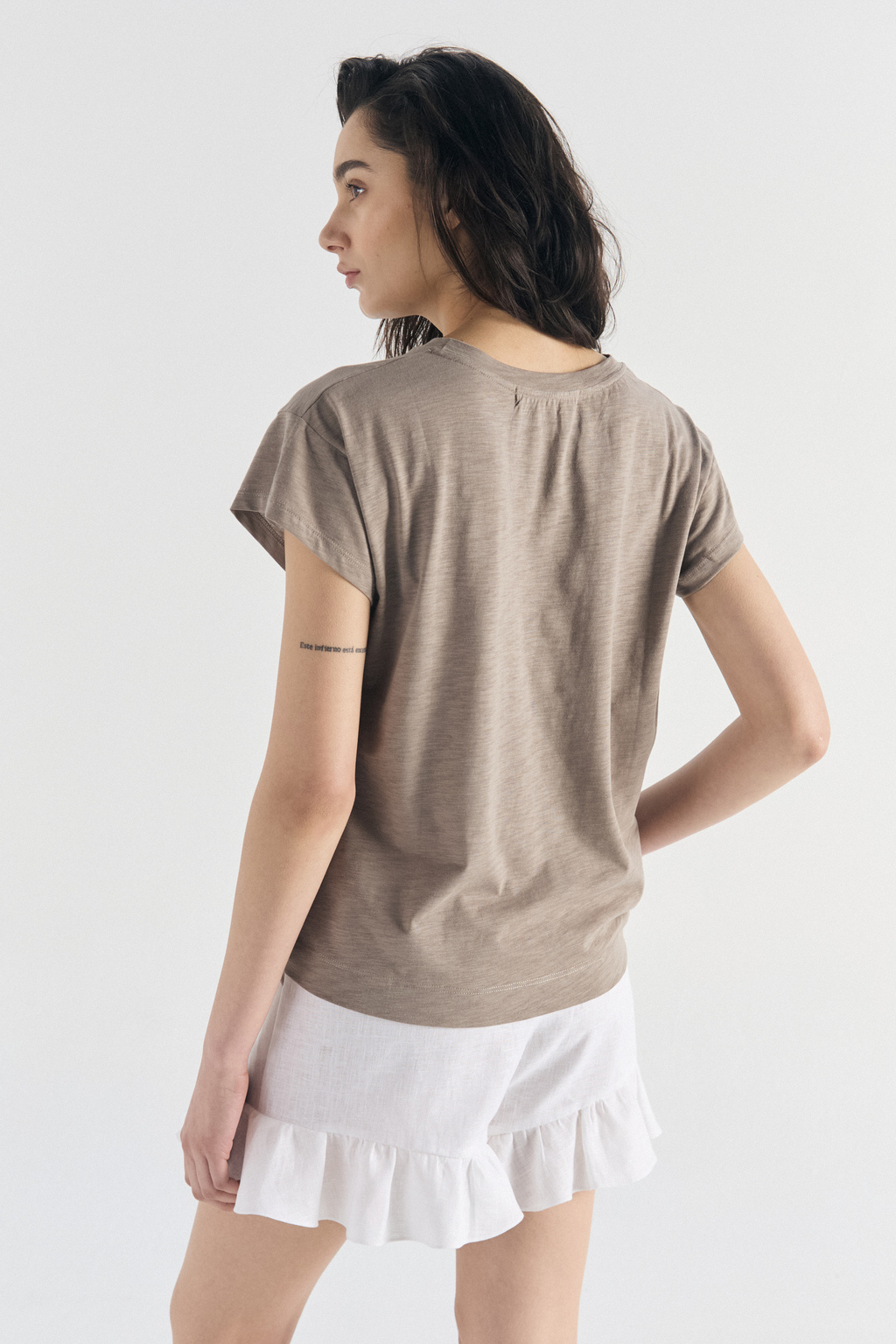 Remera cuello redondo, manga corta de linea cuadrada con el largo que es tendencia.